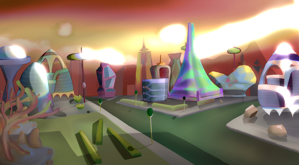 Background: Purple sky.